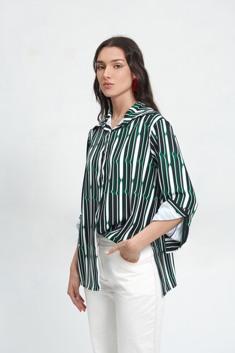 La Camisa Duna Print Verde es copada y levanta cualquier look. Perfecta para todo el año, ya sea para ir a trabajar, salir de noche o cualquier plan que se te cruce. De corte holgado, mangas con pinzas laterales y puños anchos. El cuello un poquito más grande le da un detalle que rompe con lo clásico.